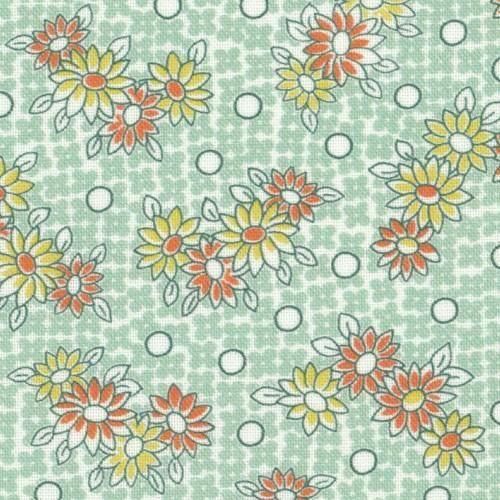 グランドに敷きつめたお花のシルエットの地紋の上に2色のマーガレットを載せました。ヴィンテージクロスのホッとする懐かしい色合いが素朴で素敵です。甘すぎないかわいさが持ち味です。